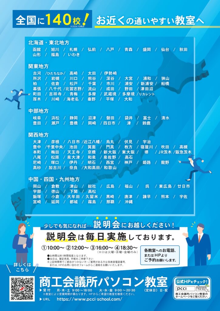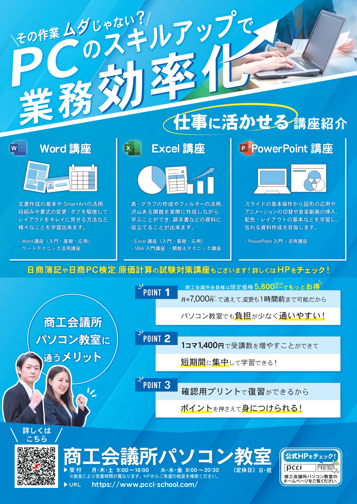 商工会議所パソコン教室 若年層向けチラシ制作 チラシ 作品タイトル商工会議所パソコン教室 若年層向けチラシ制作制作時間4時間×3日(修正は別途)コンセプト若年層にターゲットを絞るためフレッシュさを意識しつつ、崩れすぎない信頼性を四角のデザインや青のベースカラー、固すぎないフォント、適度なあしらいで受信を後押しできるツールターゲット20代~40代の男女使用ソフトIllustrator